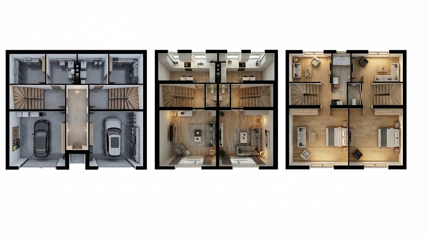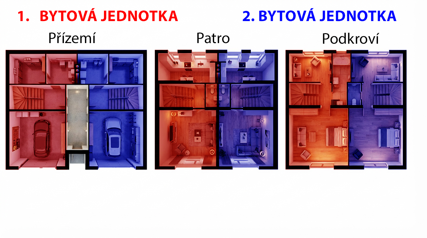 Každá z bytových jednotek o dispozici 3+1 disponuje vlastním technickým zázemím, přičemž vytápění je řešeno zcela nezávisle každý byt má svůj vlastní plynový kotel. V suterénu domu se nachází dvě prostorné garáže a dvě praktické prádelny, které doplňují sklepní prostory náležící ke každému bytu. Interiér je promyšleně rozvržen tak, aby poskytoval maximum prostoru. V prvním patře najdete dvě kuchyně o velikosti 10 m² a dva útulné obývací pokoje o rozloze 20 m² s plovoucími podlahami. Druhé patro pak nabízí dvě moderní koupelny o velikosti 4,27 m², dvě velkorysé ložnice o ploše 22 m² a dva dětské pokoje o velikosti 10 m². Na podlahách je instalována kombinace plovoucí podlahy a PVC.